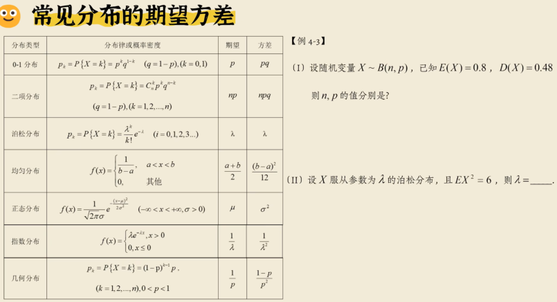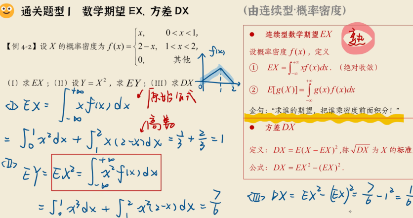 - (先求平方的期望) **连续型**概率密度数字特征: